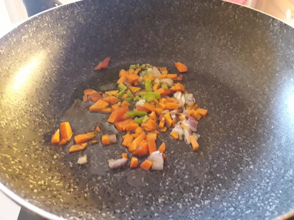 - in una padella un filo di olio e preparo il soffritto ..... far soffriggere per qualche minuto e poi aggiungere un mestolo di brodo vegetale
