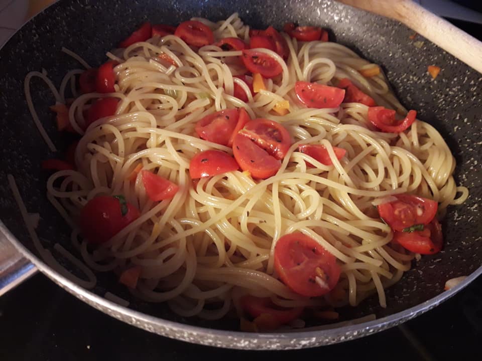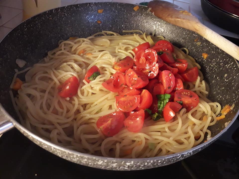 - a cottura ultimata degli spaghetti aggiungiamo i pomodorini e mescoliamo lasciando sul fuoco per un altro minuto circa.....
