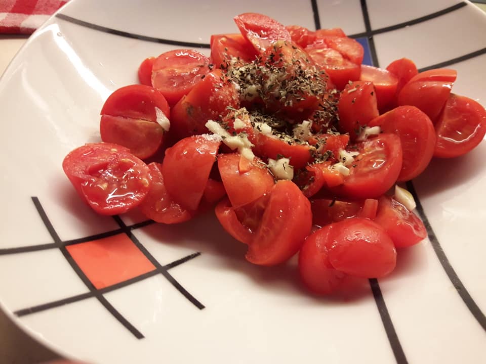 - nel frattempo prepariamo i pomodorini, in una ciotola mettiamo i pomodorini tagliati in quattro, con olio 1/2 spicchio di aglio tritato, prezzemolo, sale, curcuma e pepe