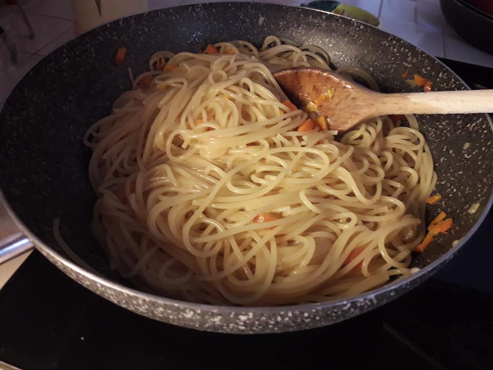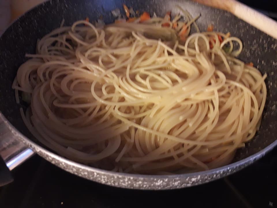 - scolo gli spaghetti a metà cottura e li verso nella padella, aggiungendo un paio di mestoli di brodo e completando la cottura