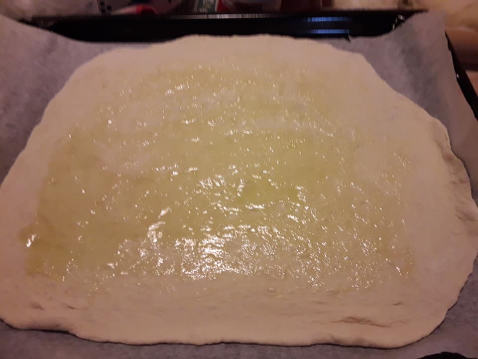 mettiamo poi la sfoglia nel testo e diamo una pennellata di olio EVO ... e poi continuiamo con il condimento