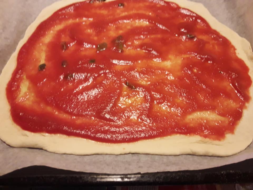 in una tazza di circa 1/2 litro versiamo la passata di pomodoro, qualche fogliolina di origano tritata, aggiustiamo di sale e aggiungiamo un filo di olio EVO mescoliamo ... poi con l'aiuto di un cucchiaio condiamo la sfoglia ... facendo dei cerchi concentrici dal centro verso l'esterno e inforniamo (forno pre-riscaldato a 250°) per circa 10' controllando di tanto in tanto... ora tiriamo fuori la pizza e aggiungiamo le fette di salame golfetta, i funghetti, la mozzarella a fettine o sbriciolata, una spolverata di parmigiano, le uova soda a spicchi e rinforniamo per altri 5' ca. .......
