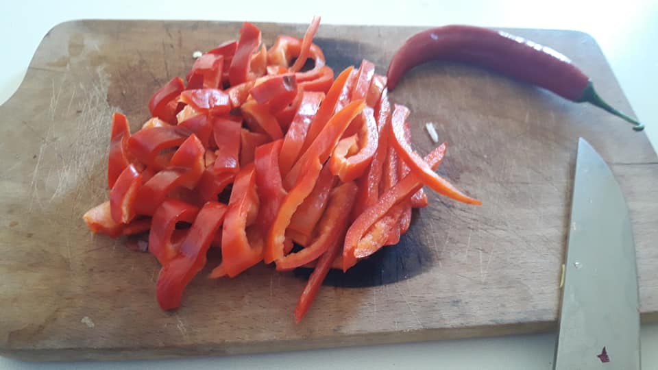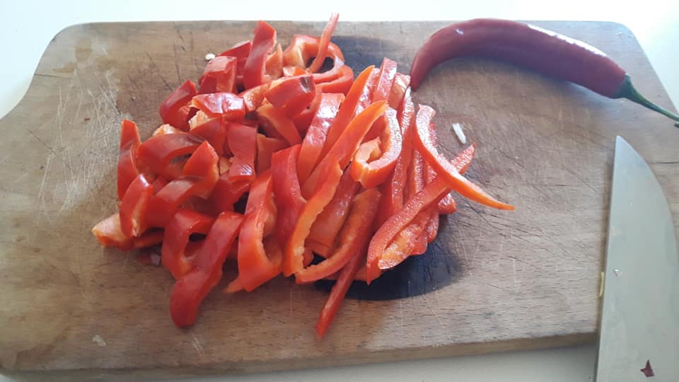 - nel frattempo tagliare il peperone a pezzetti e il peperoncino a rondelle