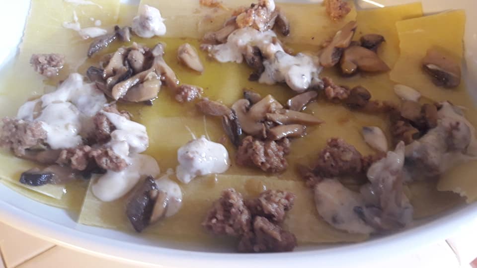 Lasagna iper ... salsiccia, funghi, uova, mozzarella e ripieno di tagliolini alla gricia