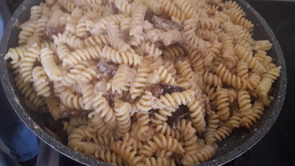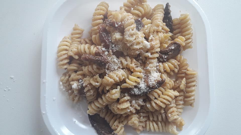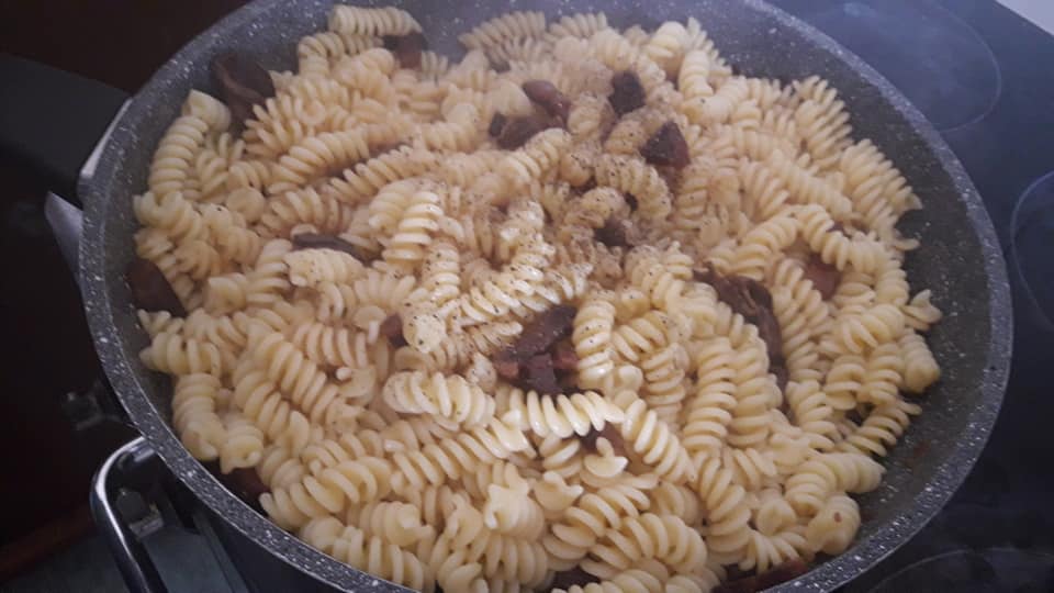 Fusilli guanciale, funghi e crema di banana