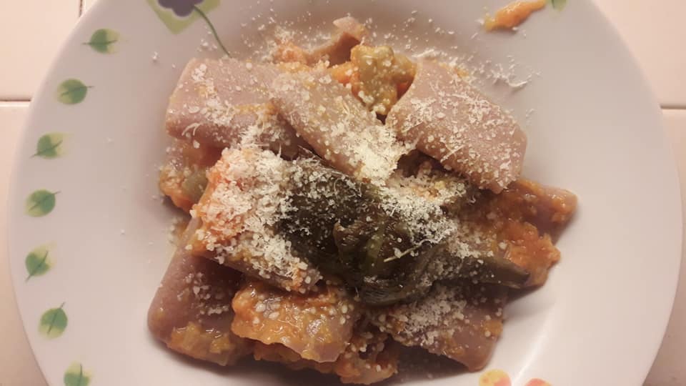 Paccheri integrali di farro, Carciofi e vellutata di zucca