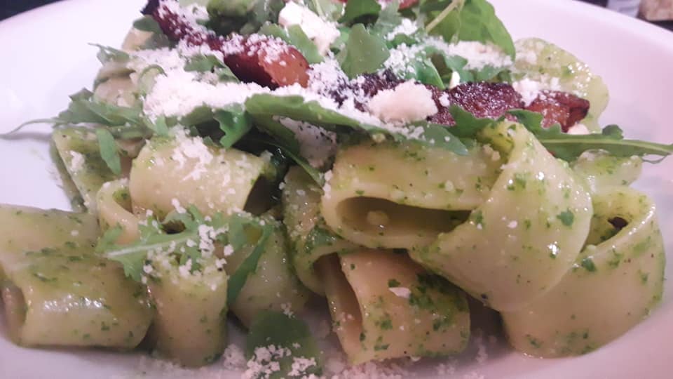 Calamarata pesto di rucola, anacardi e guanciale croccante