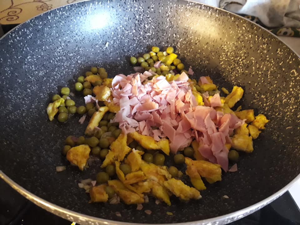 Aggiungi ora il prosciutto cotto tagliato a dadini ed i piselli già sbollentati e falli rosolare per un paio di minuti, poi togli la padella o wok dal fuoco ...